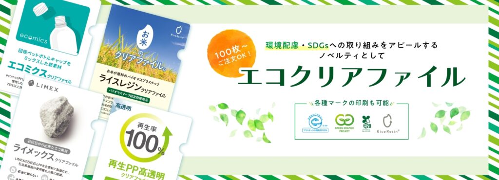 このようにクリアファイル用のエコ素材を選ぶ際に、廃棄するところまでをひとつのサイクルとして考えてみると、また違った視点でエコ素材の持つメリットやデメリットが見えてくるのではないかと思います。脱プラスチックの潮流がさらに強まり、よりいっそう環境に優しい素材への需要が高まると思われますが、素材への理解を深め、正しい知識を身に着けることにより顧客への提案もよりスムーズに行えると思います。