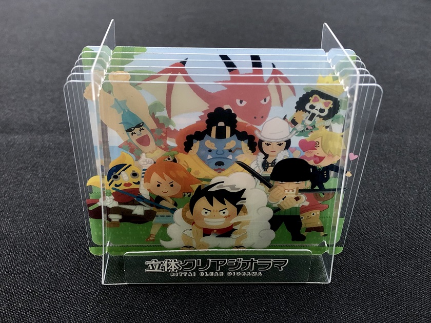 6枚の絵を重ね合わせ、奥行きを楽しむジオラマ風のクリアスタンド。