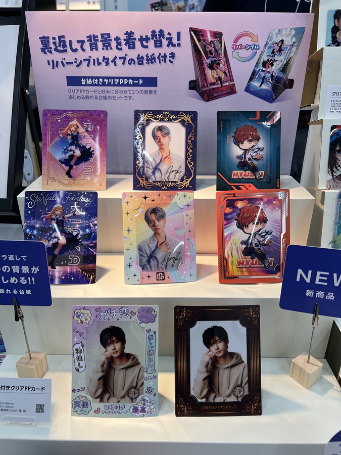 人気のクリアPPカードにリバーシブルの台紙ををセットにした商品で、推しのカードを飾れるのに加え2つの背景が楽しめるところが好評でした。